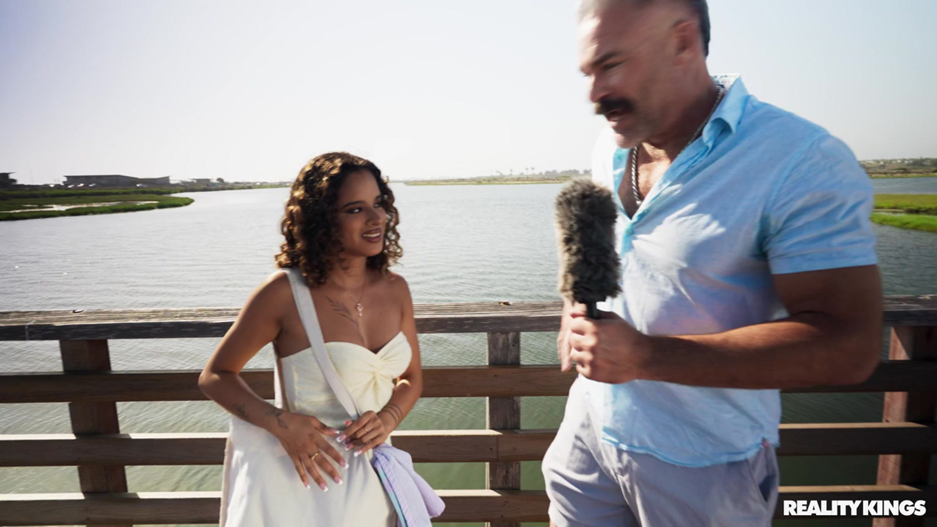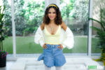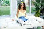 by She's NewIsabella Jules, tattooed Latina with curly hair, yellow headband, and full boobs, kicks off nude on a white couch, embraced as a man's hand …
